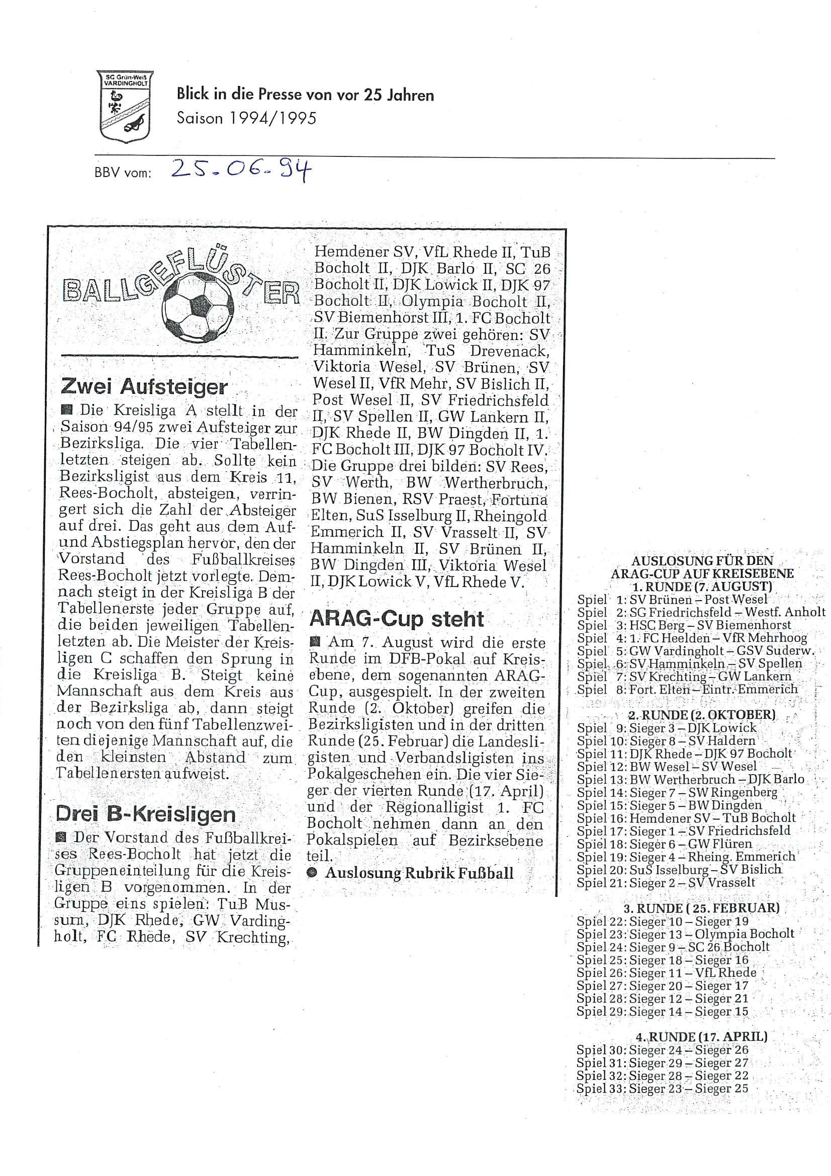 Die Aufstiege waren ein Resultat langer, harter und kontinuierlicher Arbeit und eines großen Zusammenhaltes im Verein seit Saisonstart im Juli 1994. Der Presserückblick möchte den Beteiligten, Zeitzeugen aber auch allen anderen interessierten Grün-Weiß Mitgliedern und Fans von jung bis alt einen Rückblick auf diese einzigartige Saison 1994/1995 geben.