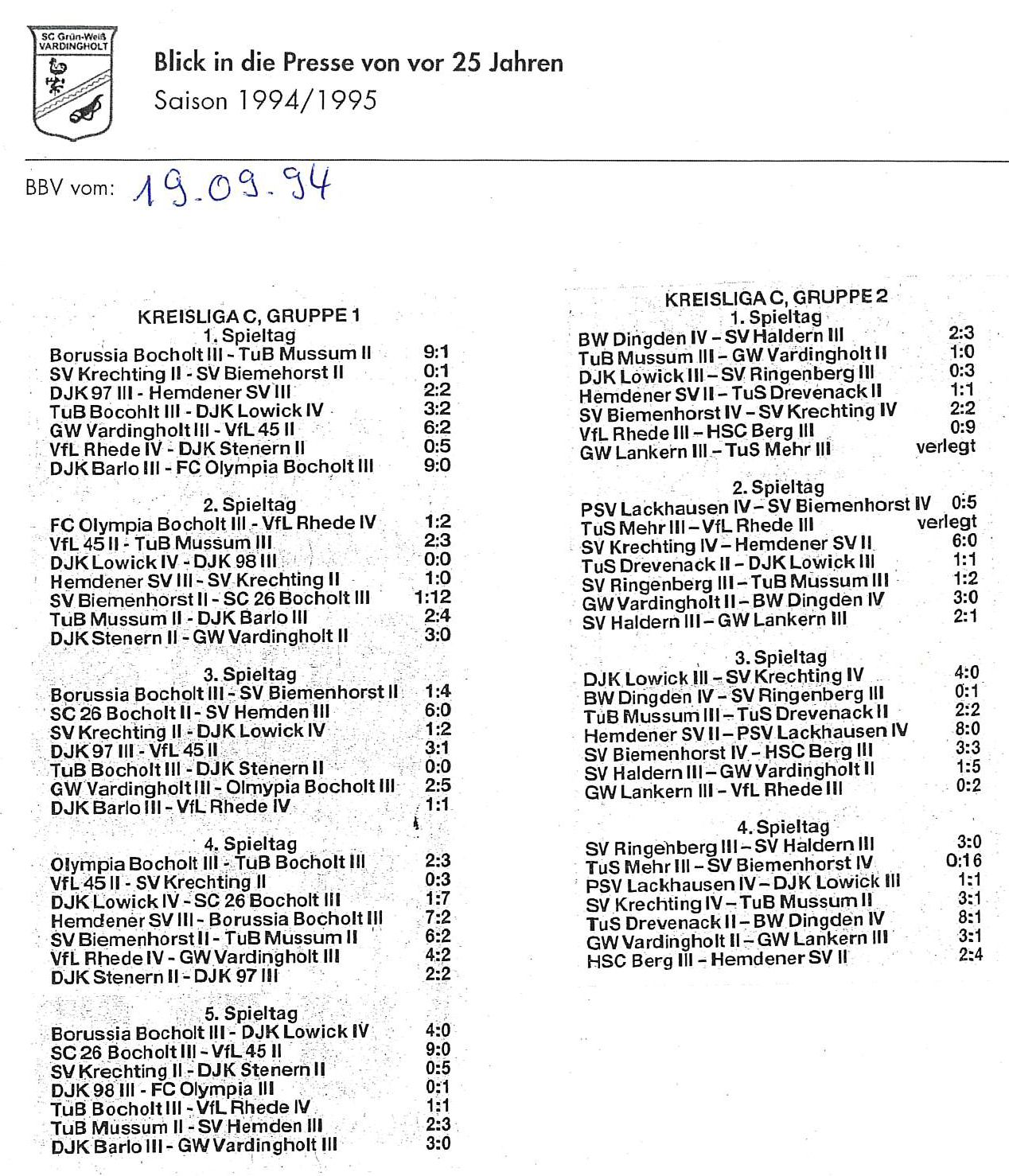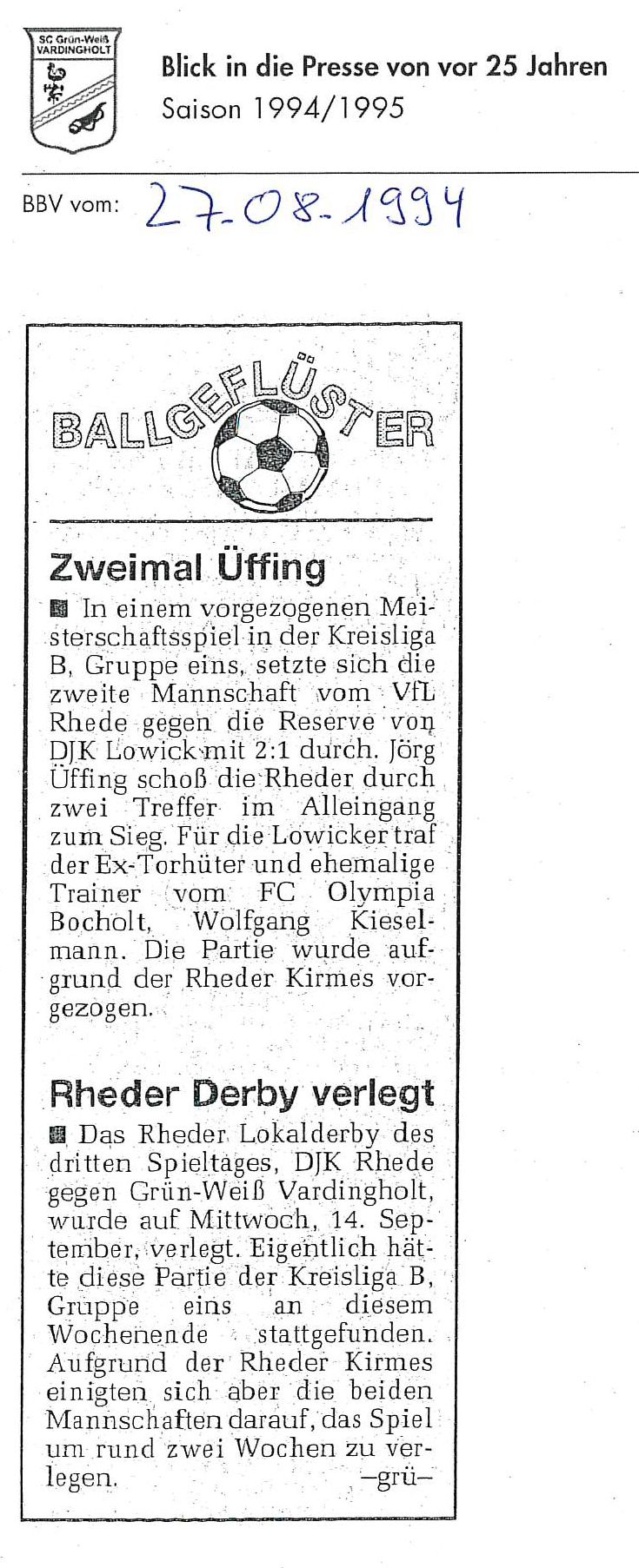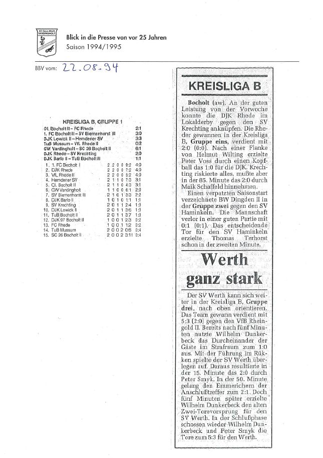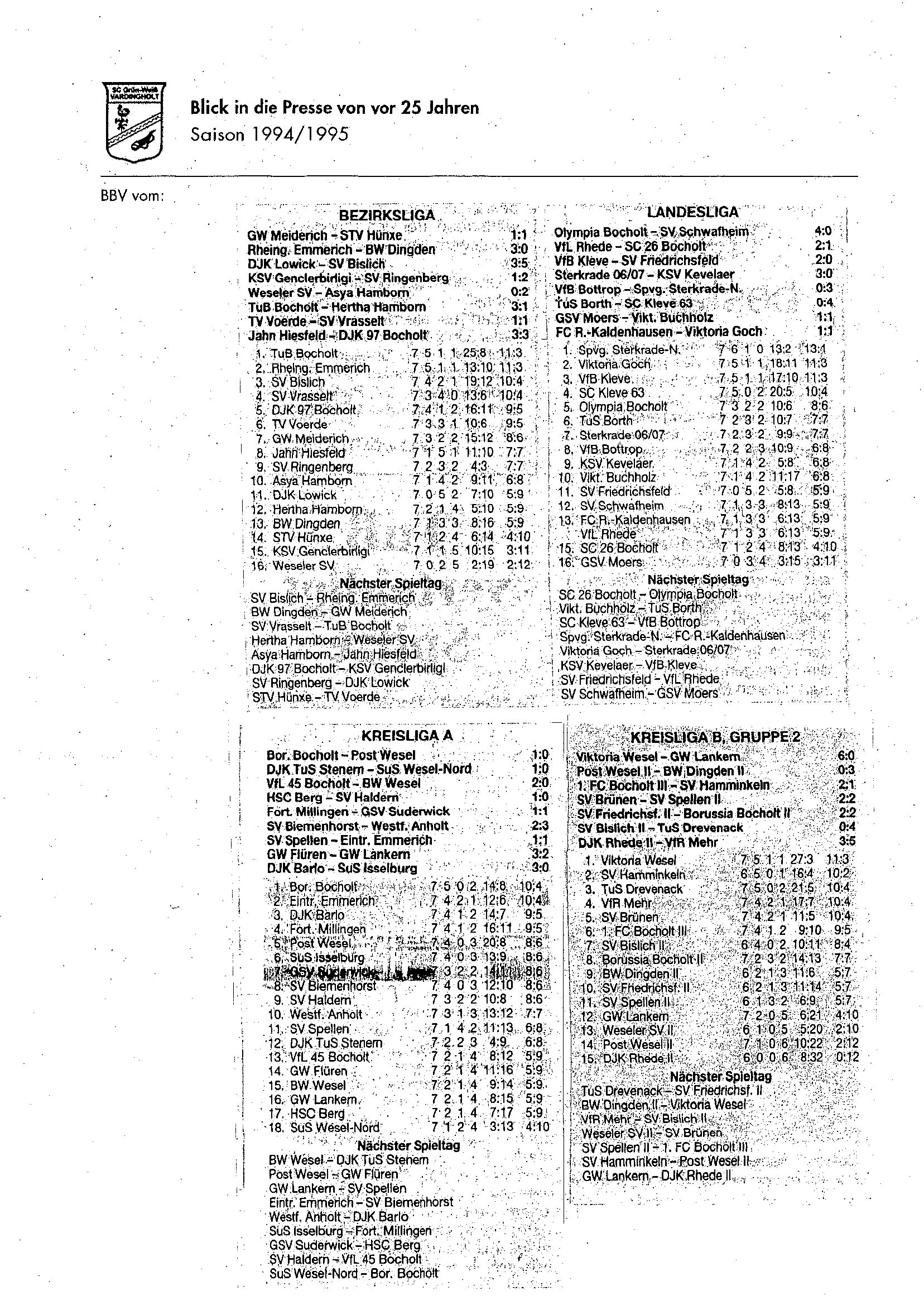 Die Aufstiege waren ein Resultat langer, harter und kontinuierlicher Arbeit und eines großen Zusammenhaltes im Verein seit Saisonstart im Juli 1994. Der Presserückblick möchte den Beteiligten, Zeitzeugen aber auch allen anderen interessierten Grün-Weiß Mitgliedern und Fans von jung bis alt einen Rückblick auf diese einzigartige Saison 1994/1995 geben.