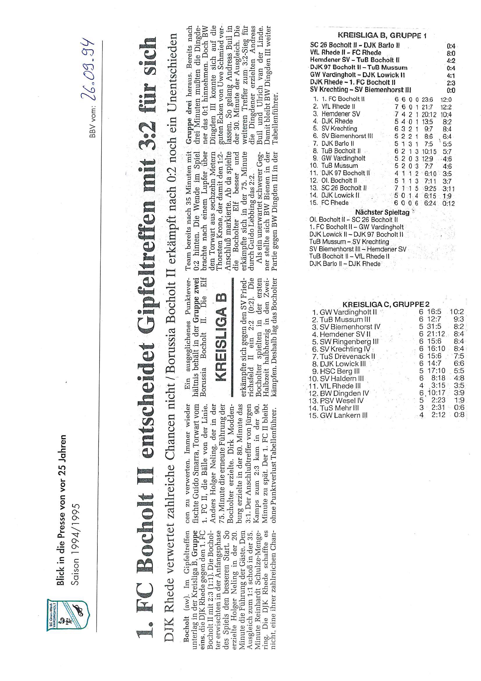 Vardingholt. Sonntag, 28. Mai 1995 – ein historischer Tag in der Vereinsgeschichte des SC Grün-Weiß Vardingholt. Sowohl die Erste Senioren-Mannschaft als auch die Zweite Senioren-Mannschaft wurden an diesem Sonntagnachmittag Meister ihrer Gruppen. Und damit gleichzeitig Aufsteiger zur Kreisliga A bzw. Kreisliga B!